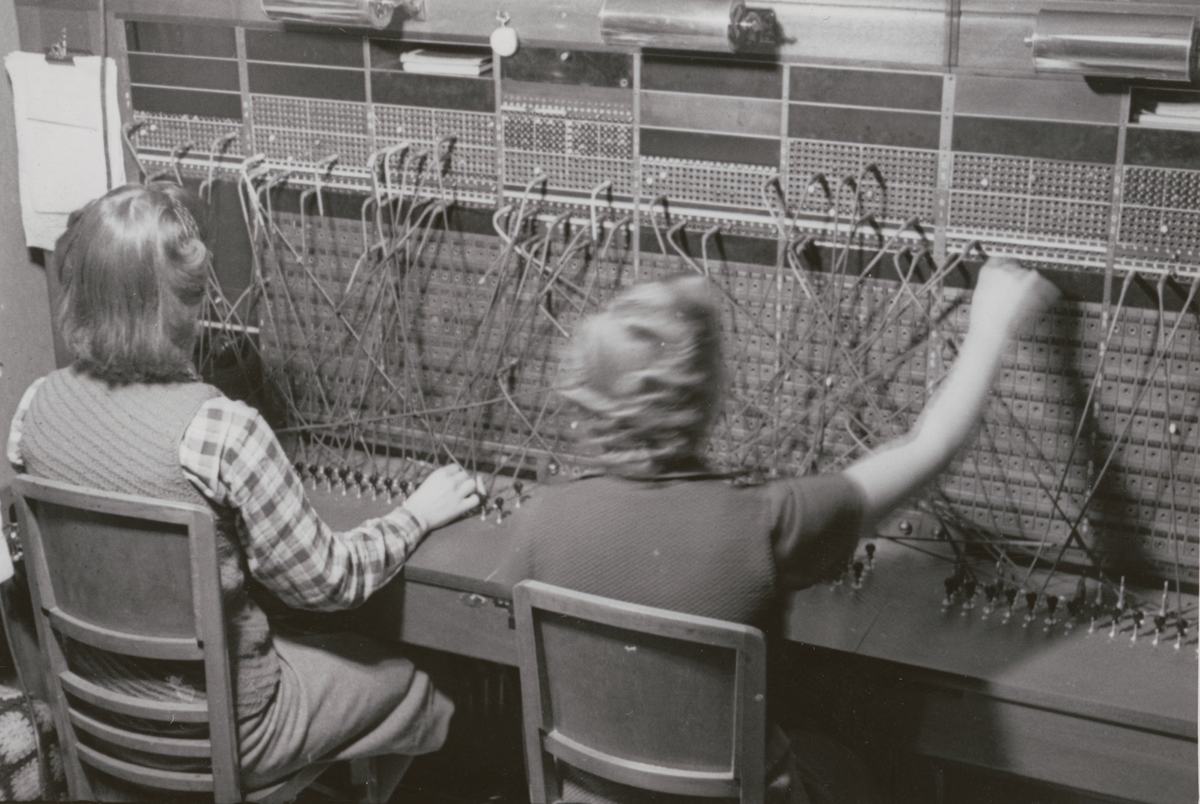 Arbetsplats telestation i Tumba. Växelbord där två operatörer sköter kopplingarna manuellt.