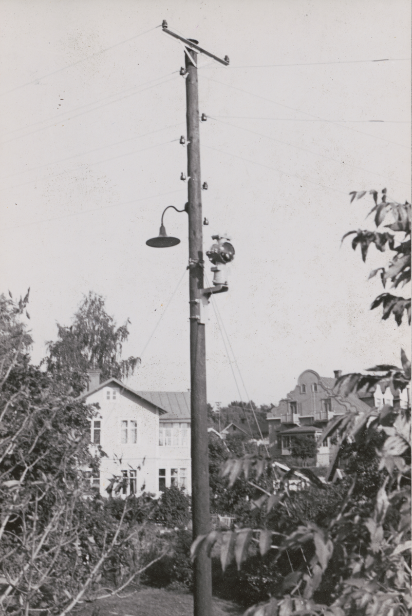 Telestolpe på Lotsberget på Dalarö, beläget intill telegrafstationen försedd med en lampa för att hjälpa till med navigering på sjön, en så kallad ensfyr.