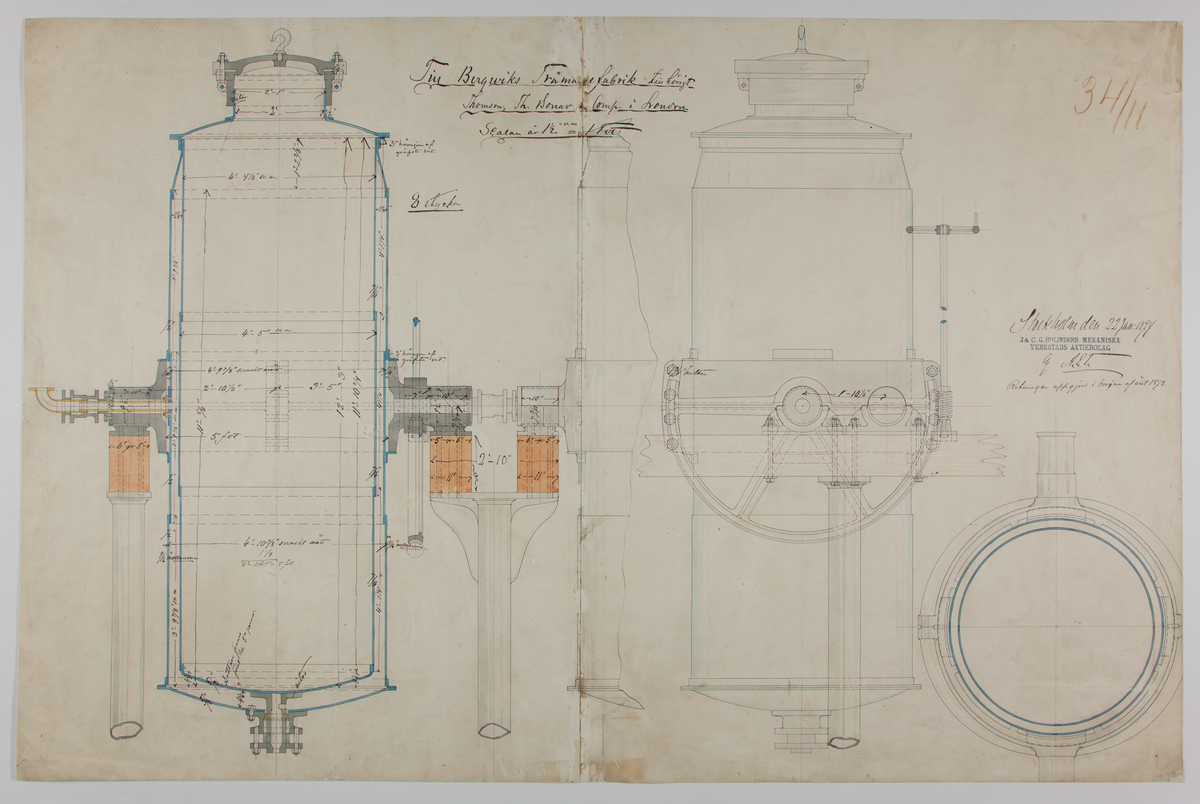 Kolorerad originalritning till kokare för pappersmassa i världens första sulfitfabrik, Bergviks Trämassefabrik i Hälsingland år 1874.