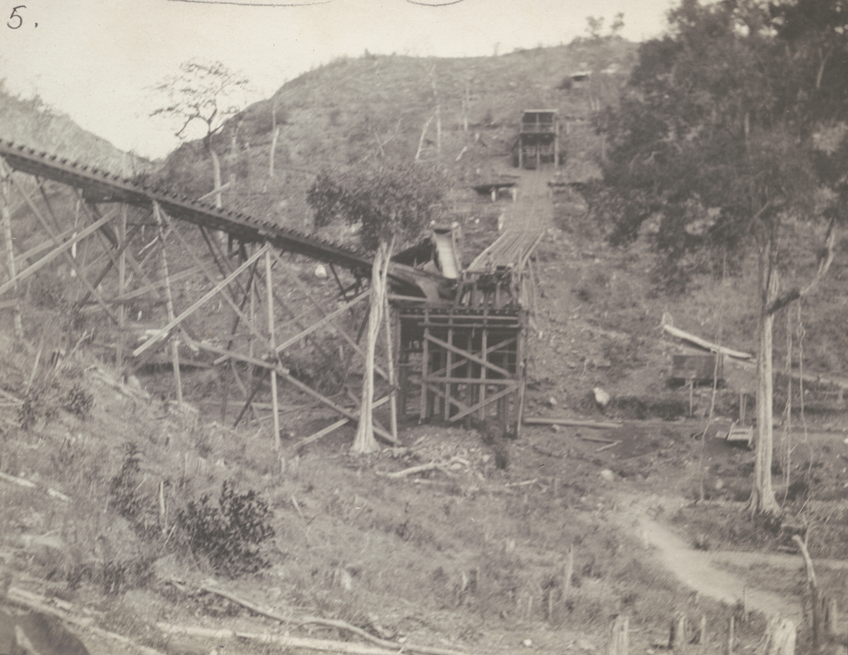 Text bak på foto: "Daiquiri Gruvor, bromsbanorfrån smågruvor på ömse sidor om dalen begagna samma malmficka, Våren 1910, Cuba 1910"