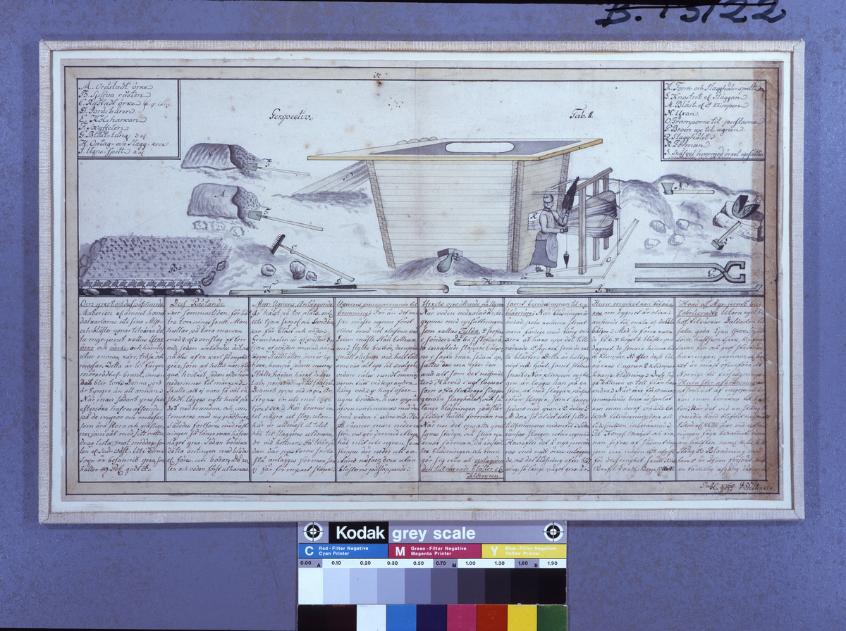 Laverad tuschteckning. Blästerugn med beskrivning 1769.