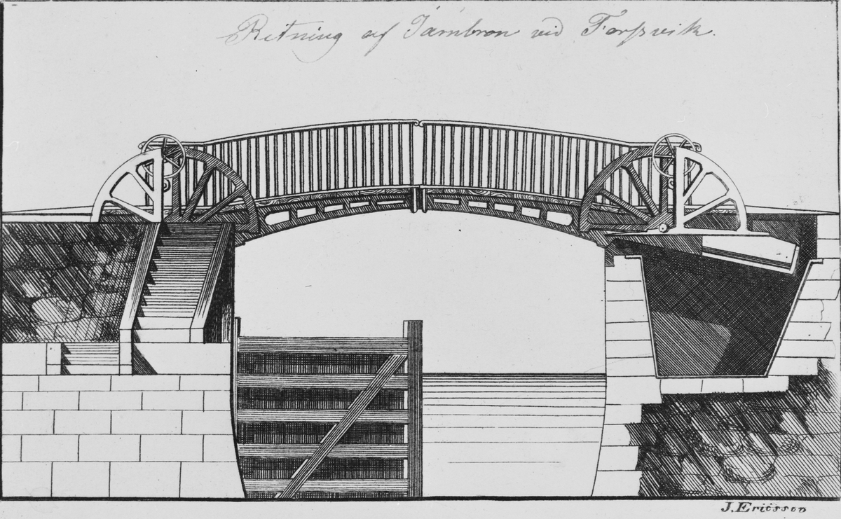 Ritning av Forsviks järnbro över Göta kanal i Västergötland. John Ericssons första gravyr.