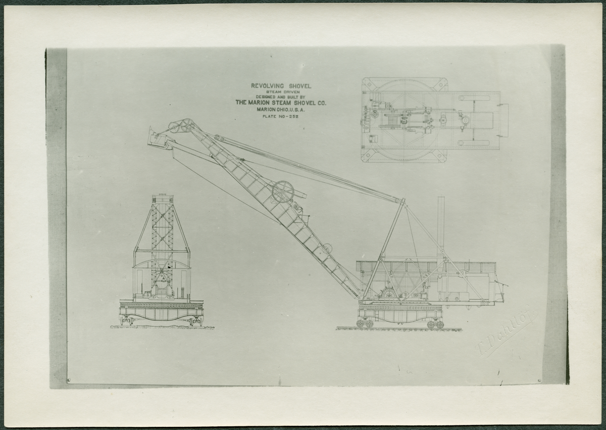 Fotografi av ritning av lyftkran med skopa. På bildens baksida står det Kiruna 1919 samt Gustaf Horn.