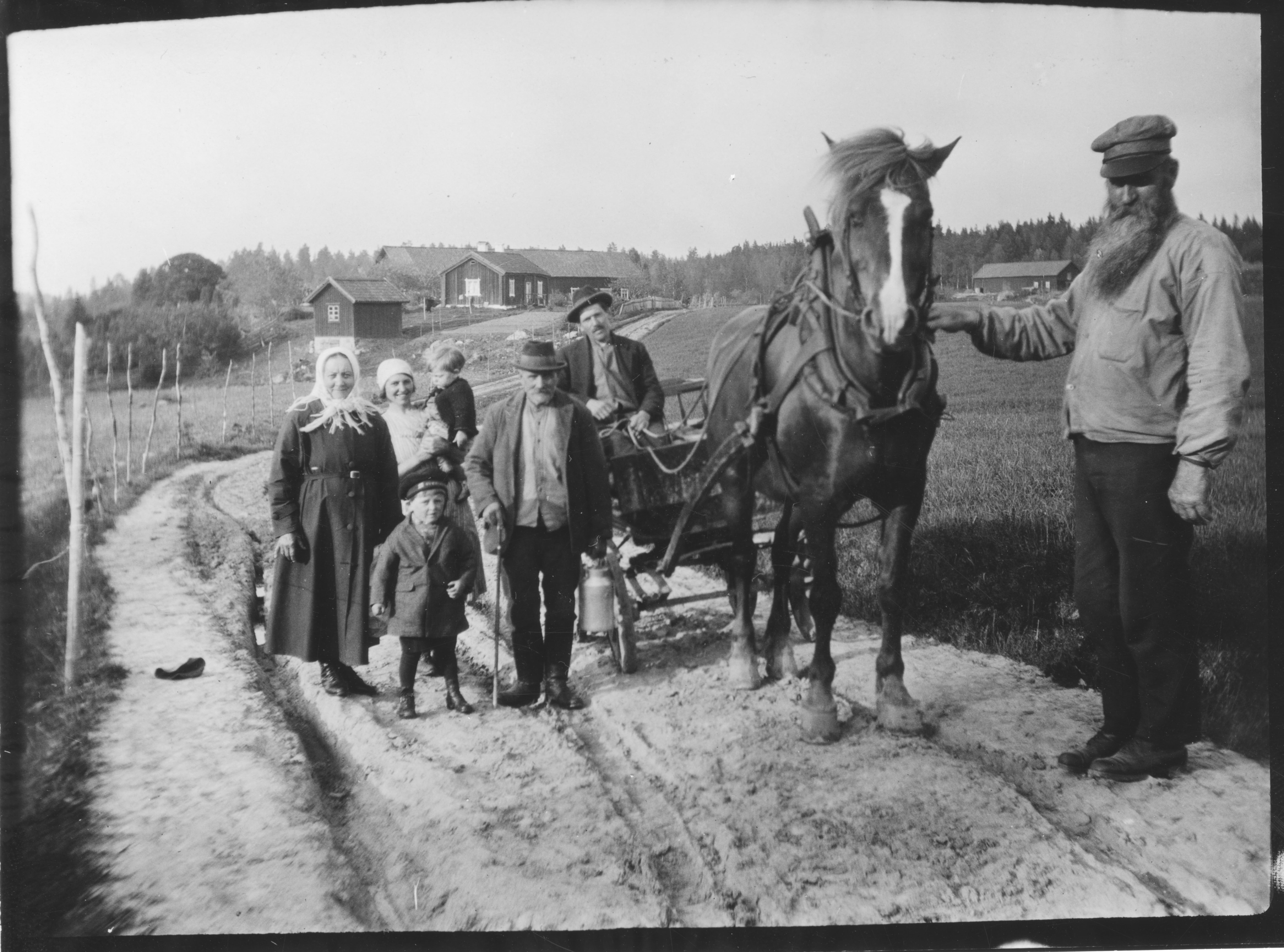 Fjärdingsmannen August Ländin och andra människor vid en häst med vagn på en väg. I bakgrunden en gård.