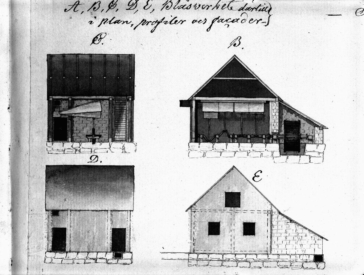 Detalj av laverad färgritning över Nya Manufakturverket i Storfors Bruk.
