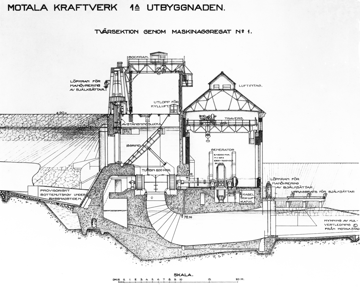 Motala kraftstation. Ritning. Tvärsektion genom aggregat 1.