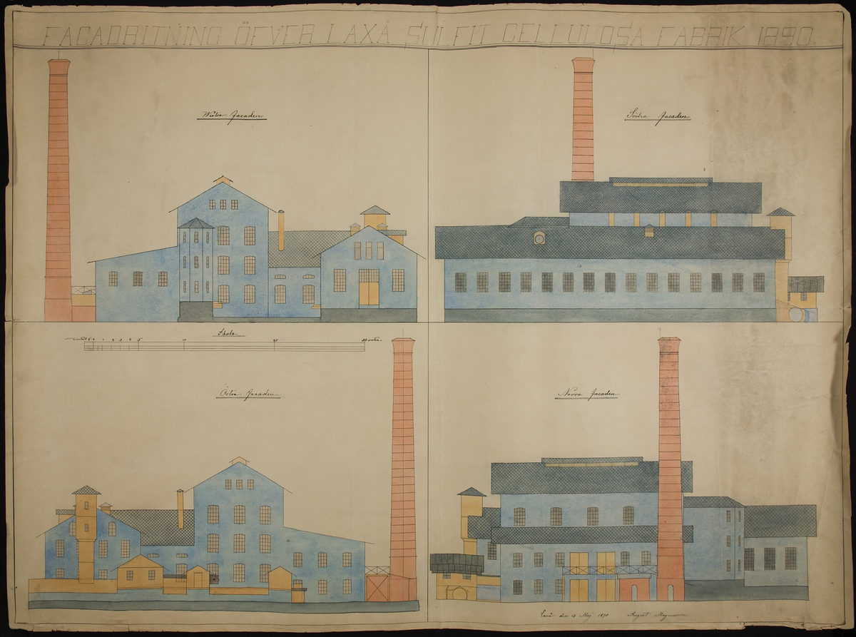 Fasadritningar över Laxå sulfit- och cellulosafabrik gjord av August Magnusson 12 augusti 1890.