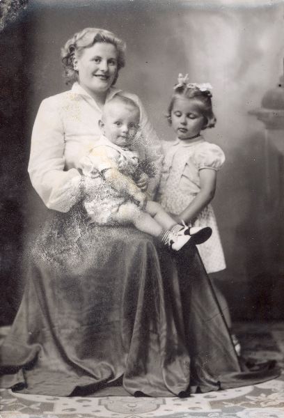 Fotografi av en mamma med två barn, en flicka står vid sidan och mamman sitter med ett barn i knäet.