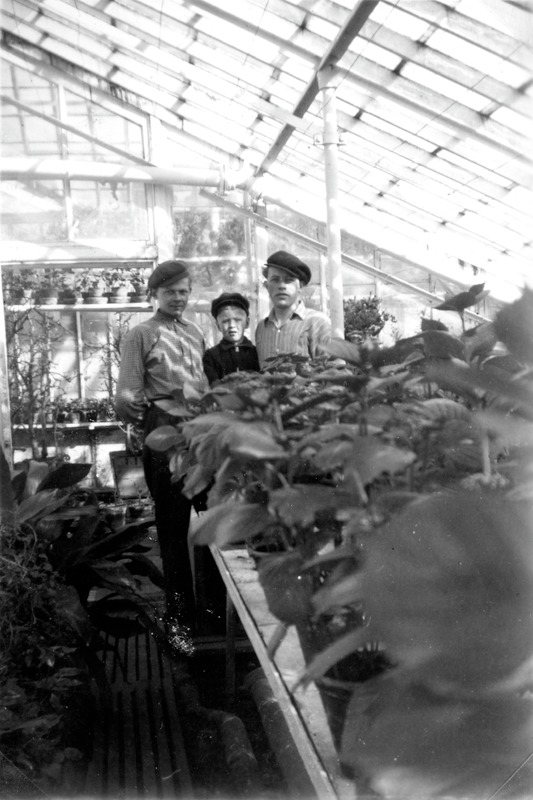 Svartvitt fotografi taget inne i växthus hos Henry Dunker. Pojken Bengt Jönsson står mellan två unga män.