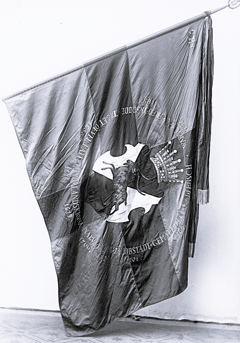 Foto av I 14, Hälsinge regemente Flagga, fana med texten "Novgorod 1611. Warszawa 1656. Frederiksodde 1657. Tåget öfver Bält 1658. Lund 1676. Landskrona 1677. Narva 1700 1701 Jacob 01. Jacob 1701. Gemäuerthof 1705 Gadebusch 1712".