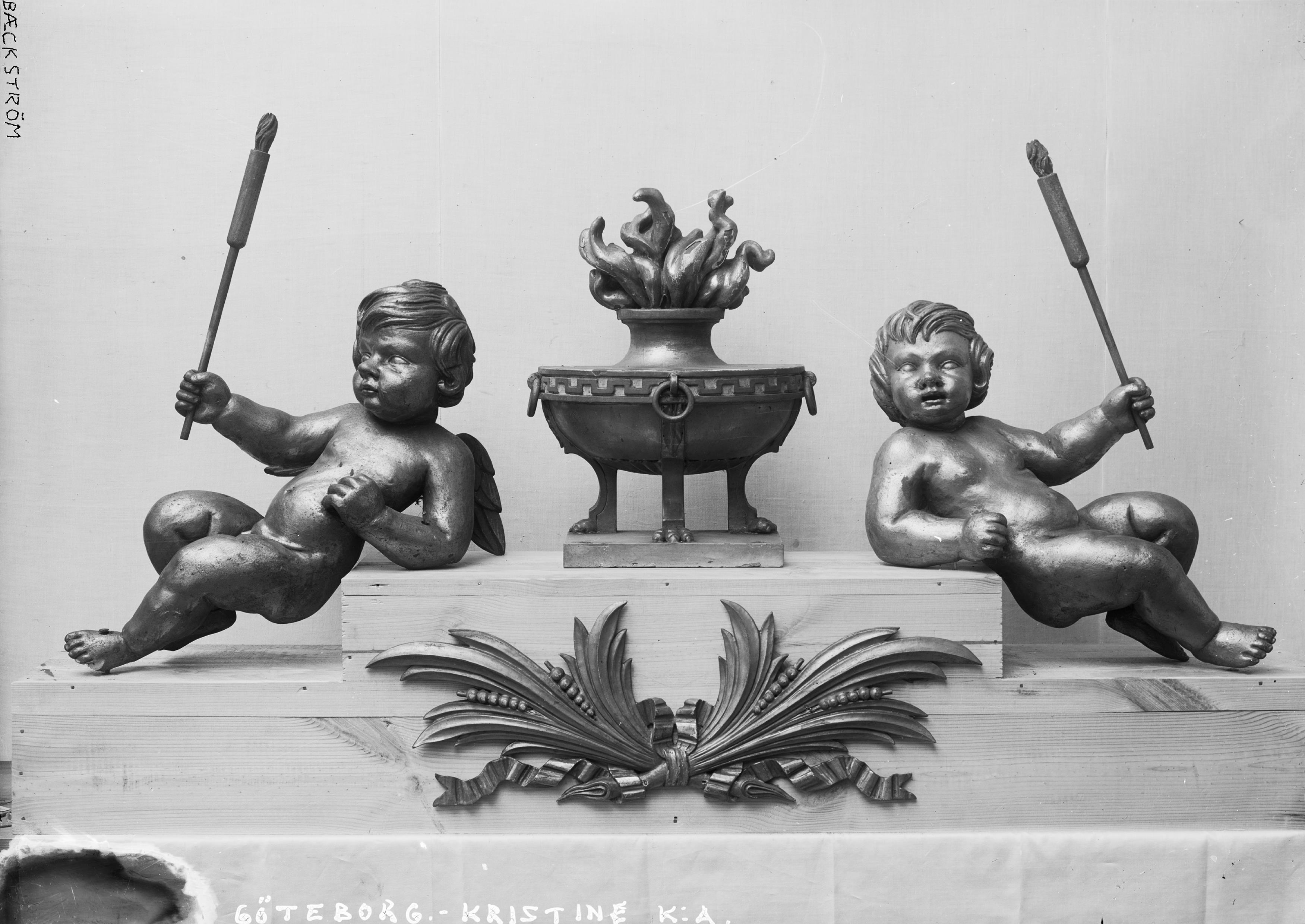 Putti, trefot och palmkvistar, har möjligen utgjort krön till gallergrind mellan Aschebergska gravkoret och kyrkan. Snabbinv.