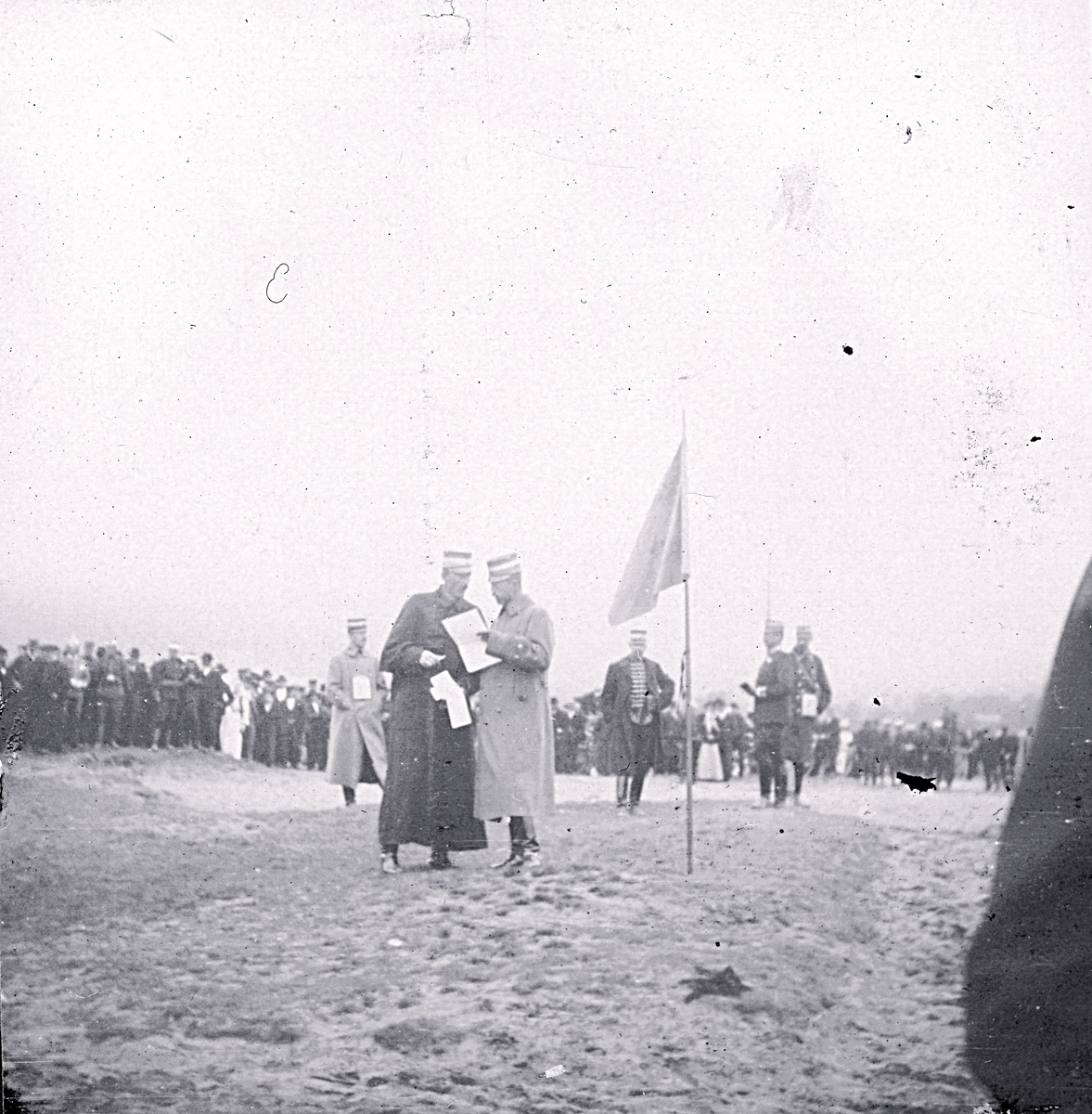 Foto av militärer och en skara med människor som åskådare, kanske en fältövning ska börja.