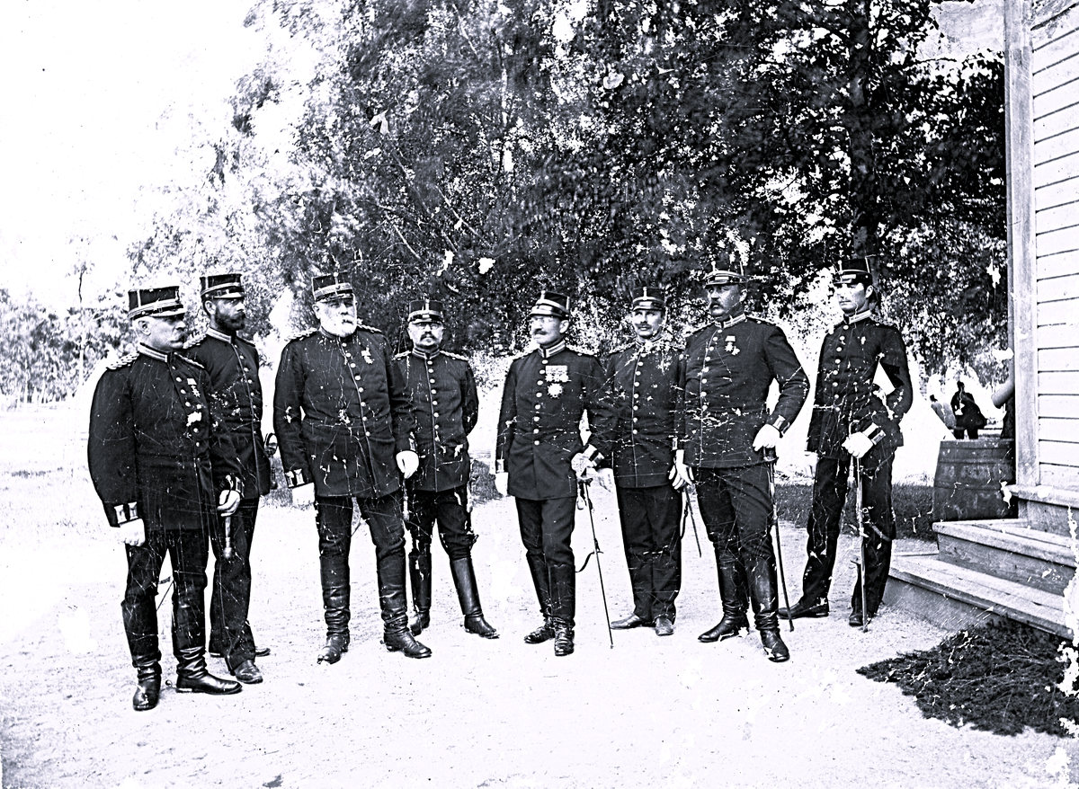 Foto av regementsstaben. Text i album: Fr v Brehmer, Fineman, Reuterskiöld, Moberg, Schenström, Malmberg, von Schoultz och Säfvenberg.
