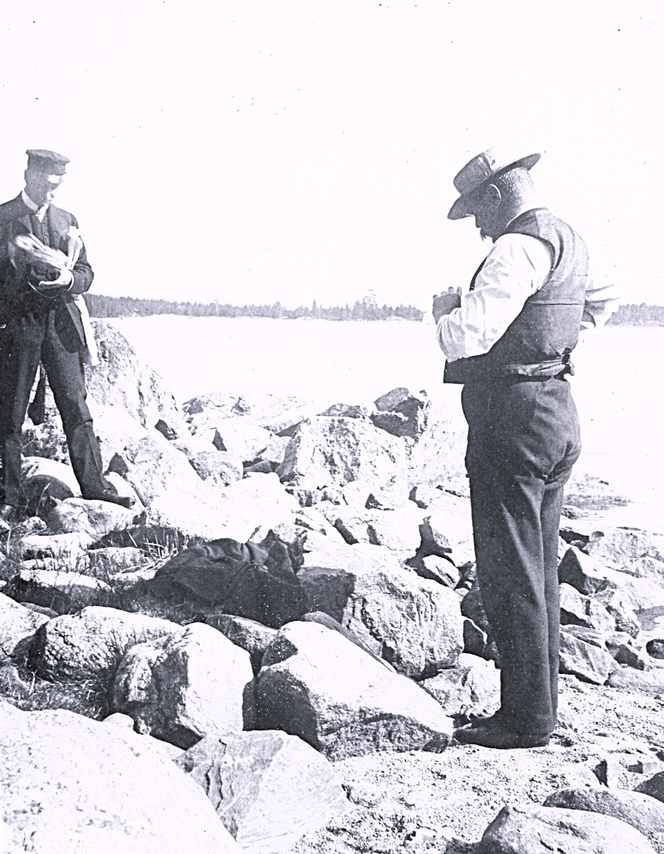 Foto av två män som står vid en stenig strand eller klippor vid vattnet.