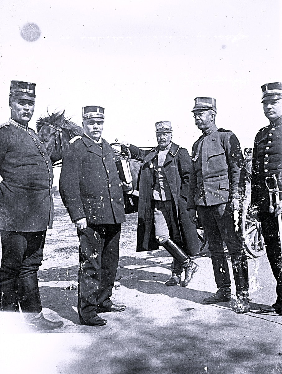 Foto av uniformerade män som är ute på fältövningar. Text i album: "Fr v. Rutberg, Gyllensvärd, Dubois, Svedelius och Wigert".