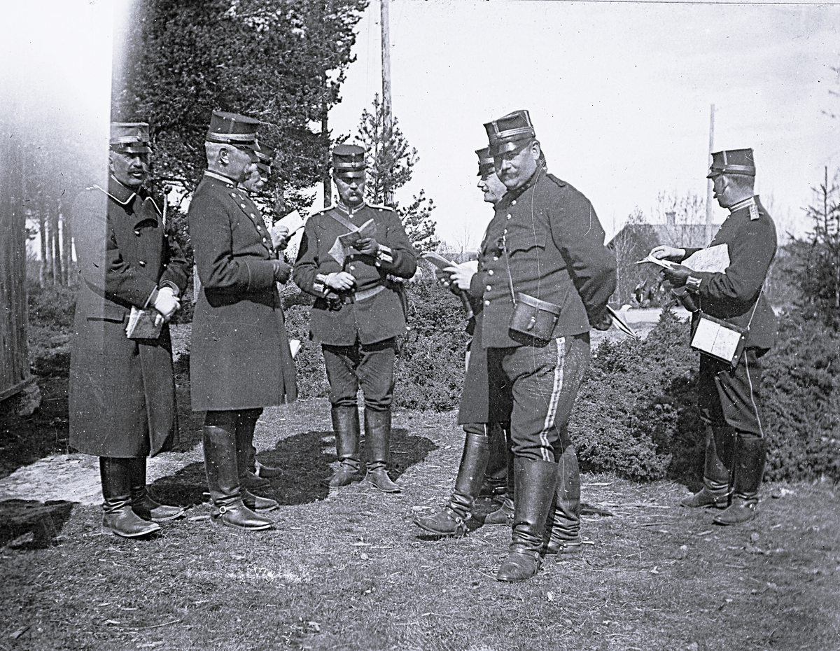 Foto av en grupp militärer som är ute på fältövningar. Text i album: "Fr v. Dubois, Rosenblad, Gyllengahm, Rutberg, Säfvenberg, Gråå och Forsgren".