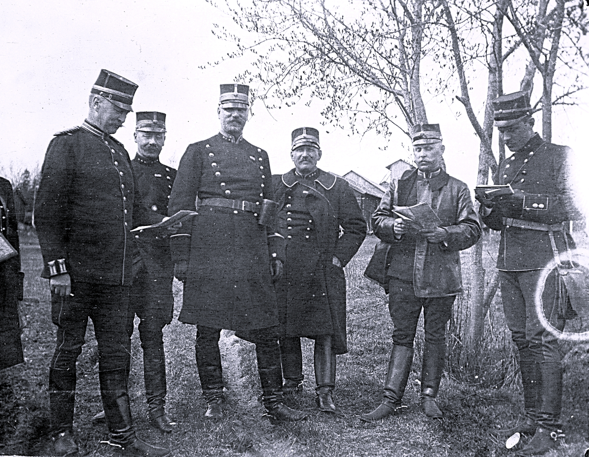 Foto av en grupp militärer som är ute på fältövningar. Text i album: "Fr v. Gardtman, Trönnberg, Tauvon, Huss, Schöning och Lilliehöök".