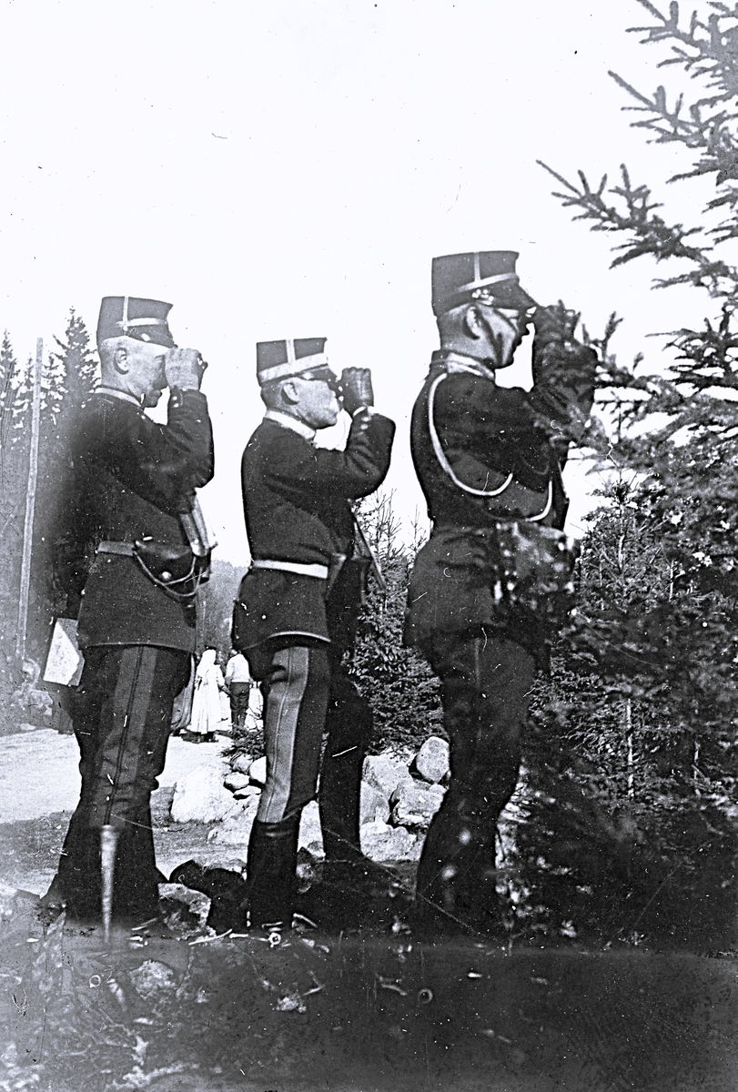 Foto av militärer som spanar med kikare ute på fältövningar. Text i album: "Fr v. Sundin, Warberg och Petré".