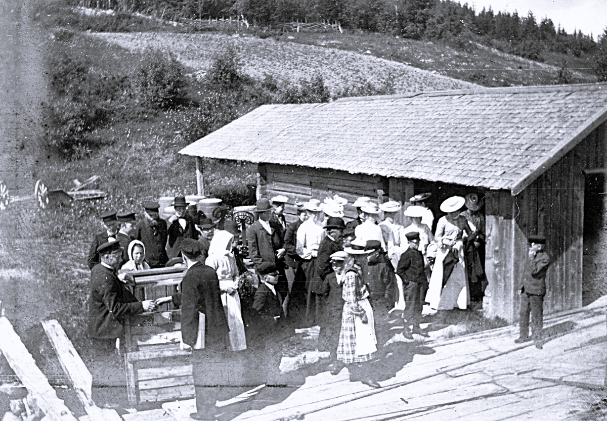 Foto av en grupp människor som har samlats utomhus, troligen för ett evenemang eller en sammankomst, vid någon form av byggnad med ett landskap i bakgrunden.