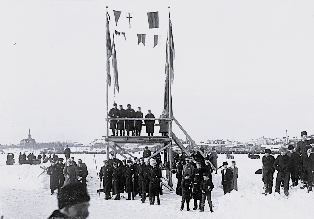 Foto av en folksamling som beskådar ett evenemang, däribland syns en del militärer som står på ett podium som är behängd med flaggor. I bakgrunden syns konturerna av en stad. Text i album:" Kapplöpningar i Umeå 1905".