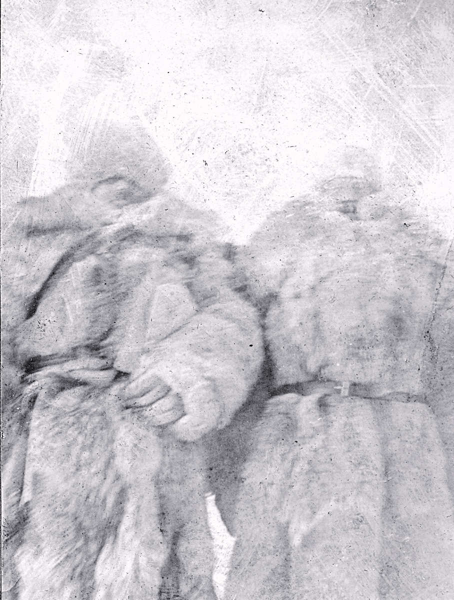 Foto av påpälsade militärer under arméfördelningens fältövningar 1905. Text i album: "Fr v. Björkman och Hjertström".