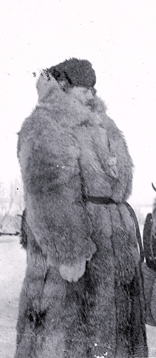 Foto av en påpälsad militär under arméfördelningens fältövningar 1905. Text i album: " Doktor Arpi, I 14".