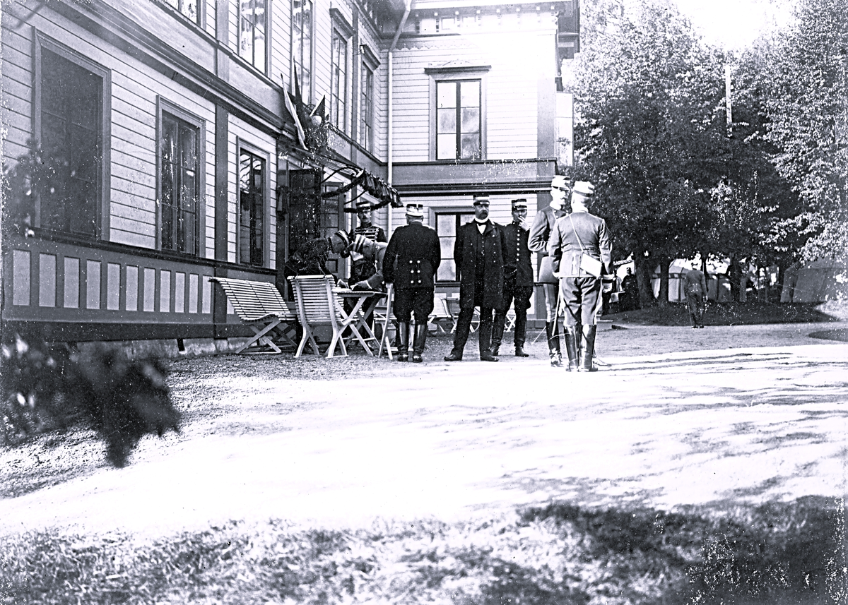 Titel: Foto av en grupp militärer som står bredvid en byggnad med en trädgård till höger i bild.