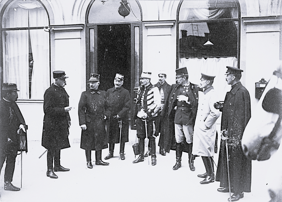 Foto av en grupp militärer som står framför en byggnad med stora fönster. Fältmanövern i Hälsingland 21-25 september 1904. Text i album: "Fr v. Akashi-öfv, Lytken - generalmajor, Fivé-öfv, Hasselrot-öfv-löjntn. ,de la Panouse-kapten, Adlercreutsz-löjtnant, Matuckha-överste, von Pritzelwitz-gen.maj, Barnardiston-överste".