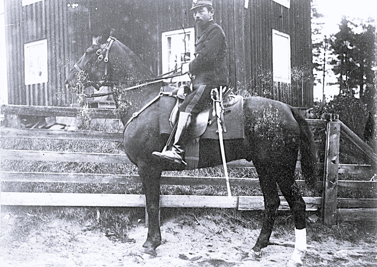 Foto av Akashi Motojiro i uniform till häst med ett staket och byggnad i bakgrunden. Text i album: "Öfverste Akashi".