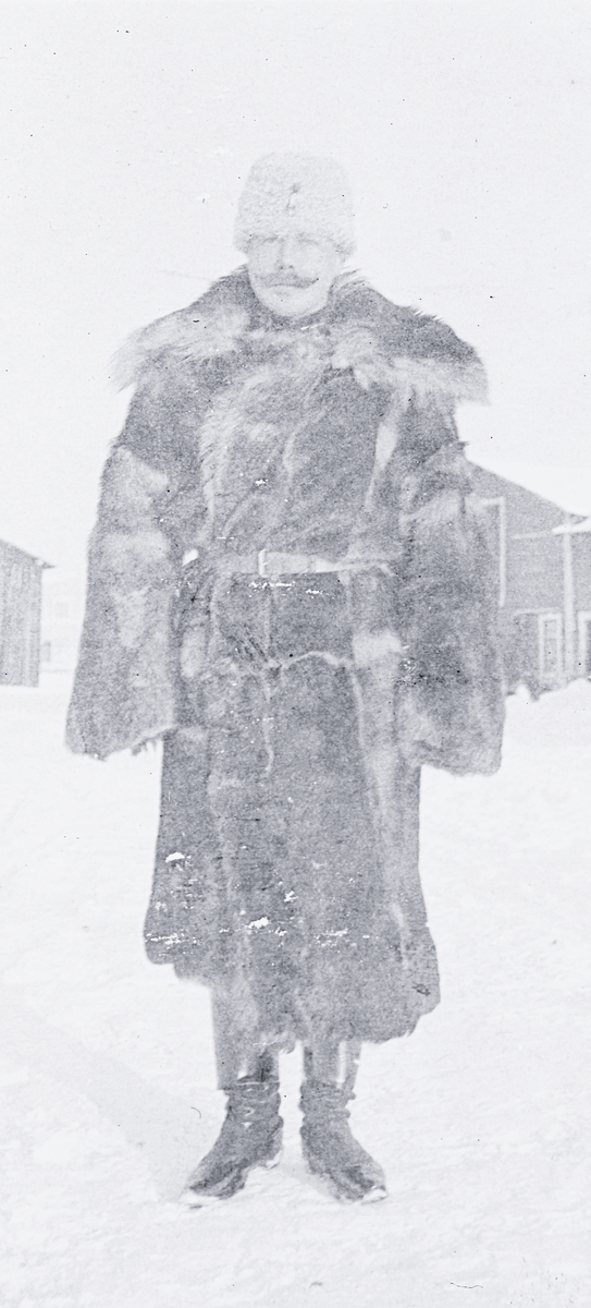 Foto av en påpälsad militär under arméfördelningens fältövningar 1905. Text i album: "Kapten Duse, A4".