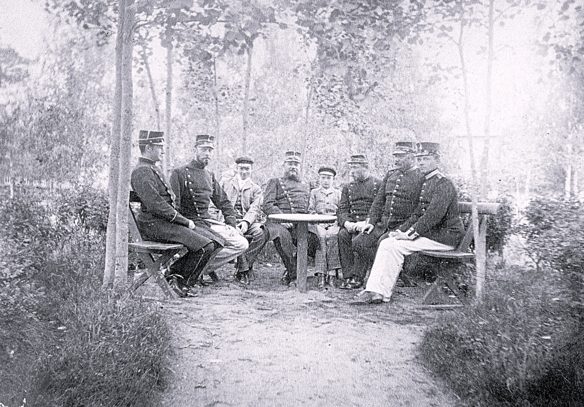 Foto av uniformklädda män i "Liflunden" 1893. Fr v. Säfwenberg, Carlén, okänd, kapten Sundstedt, okänd, löjtnant Söderberg, Nisbeth och officersaspirant Sundstedt (enligt text i album).