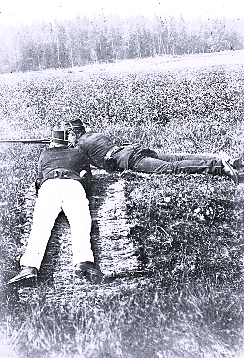 Foto av två män med uniform som ligger och har skjutövningar. Text i album: "Fr v. Norman och af Petersens.