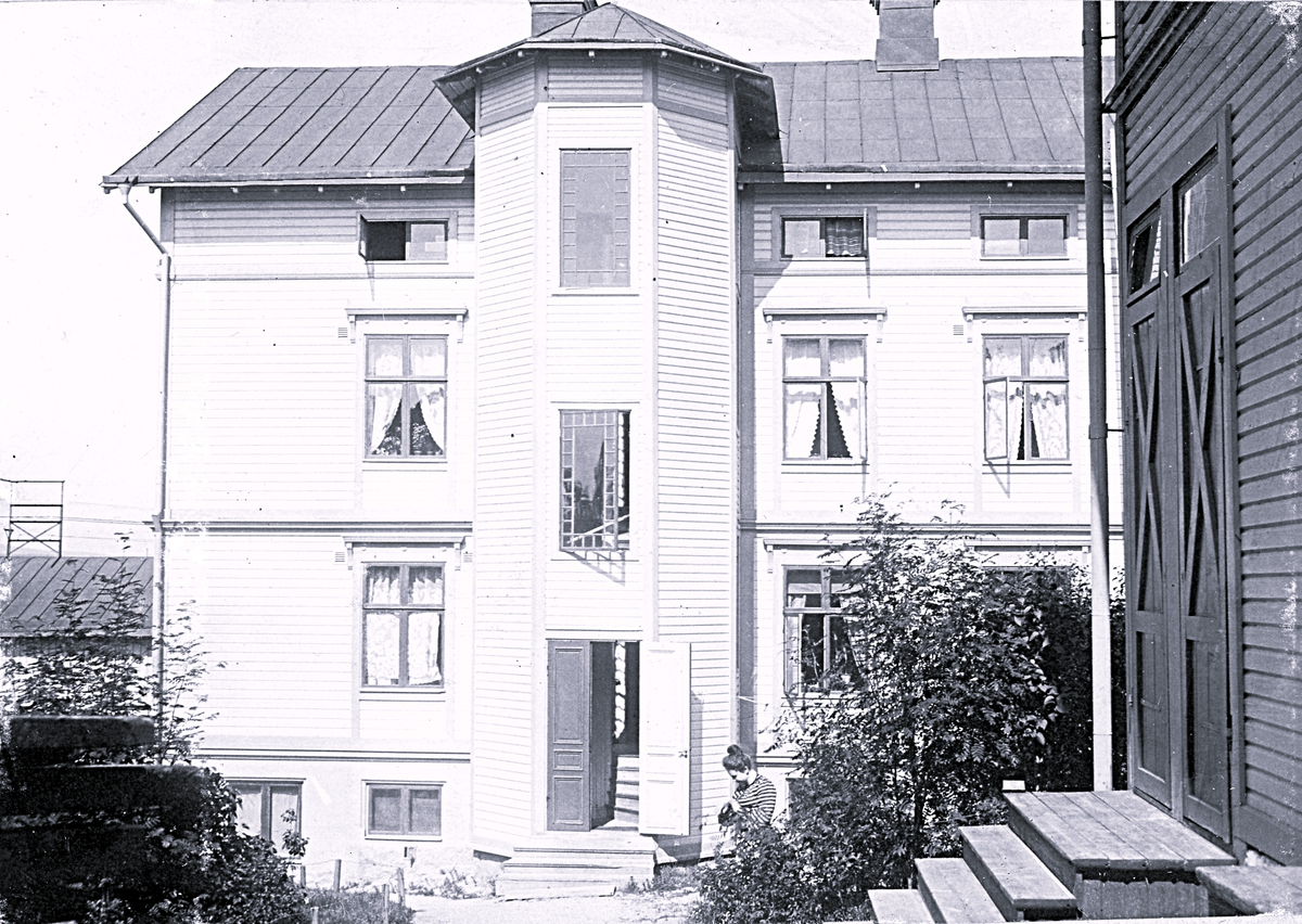Foto av ett stort trähus med en framträdande trapphusliknande utbyggnad i mitten med flera fönster och en trapp som leder upp till entrén. Till höger om huset syns en del av en annan byggnad, eventuellt en lada, med en stor dörr.