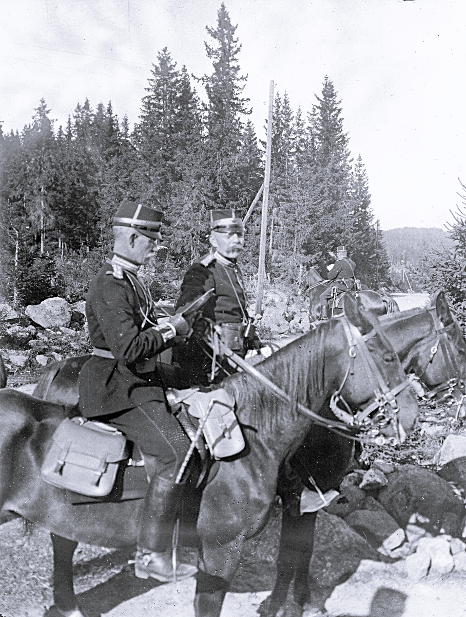 Foto av militärer till häst som är ute på fältövningar. Text i album: "Fr v. Dillner och Aspgren" (längst fram i bild).