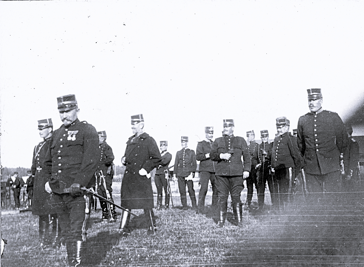 Foto av en grupp militärer på fältövning. Text i album: "Vid A.4 1904".