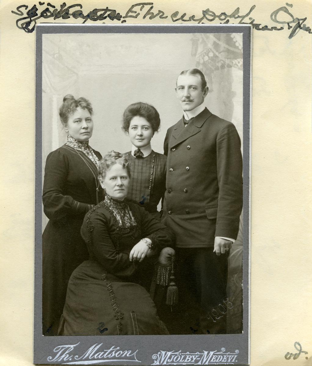 Medlemmar av släkten Ehrenpohl förevigade i Thekla Matson ateljé i Mjölby 1905. Från vänster Ebba Ehrenpohl. Den yngre kvinnan är Thyra Hollander, gift med mannen vid sin sida, sjökapten Sixten Ehrenpohl. Sittande ses Ebbas yngre syster Carolina Ehrenpohl, föreståndare för posten i Boxholm i många år. Sixten var brorson till systrarna Ehrenpohl.