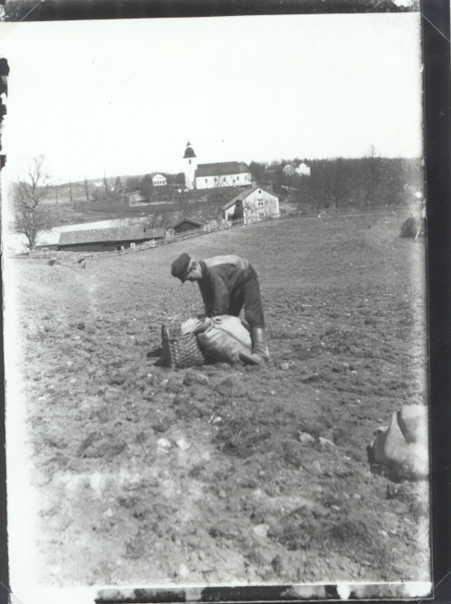 Potatisplockning på gärdet. I bakgrunden syns Hjorteds kyrka.