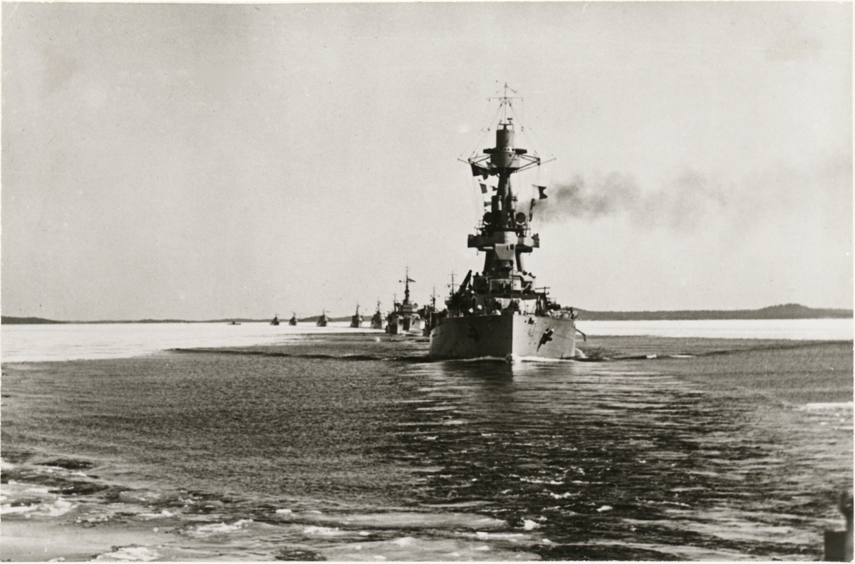 Pansarskeppet DROTTNING VICTORIA i täten för en flottilj.