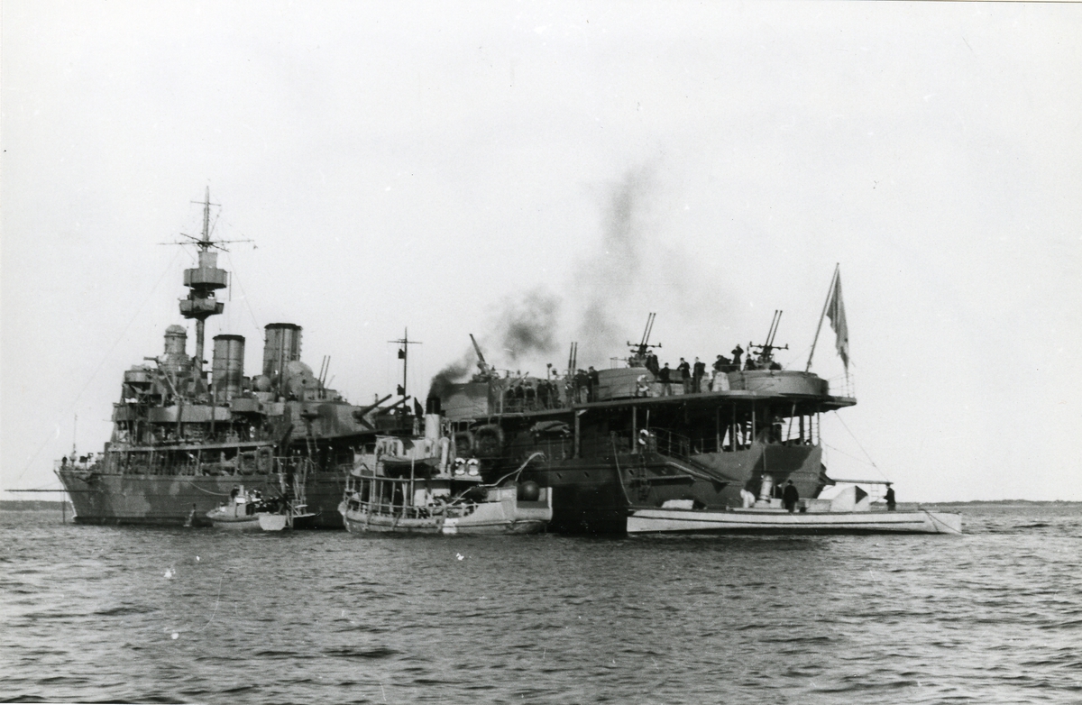 Luftvärnskryssaren GOTLAND till ankars. Två motorbarkasser och ett minfartyg långsides.