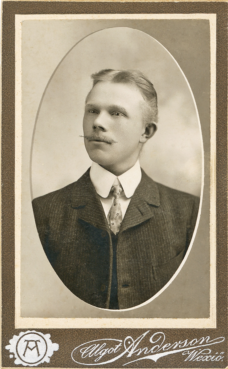En okänd man med mustasch, klädd i kavajkostym, mönstrad slips och stärkkrage.