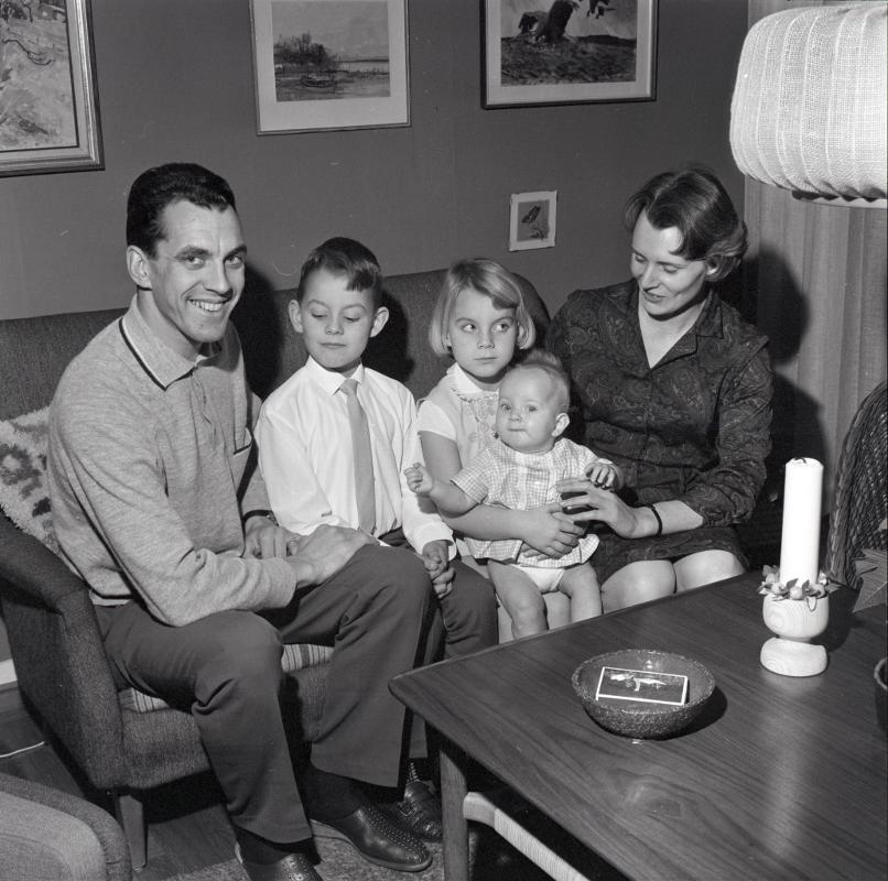 En man, en kvinna och tre barn sitter i en soffa tillsammans. Framför dem syns ett soffbord. På bordet står en ljusstake med ett blockljus samt en skål. Ovanför bordet hänger en taklampa. På väggen bakom dem hänger tre större tavlor och en mindre.