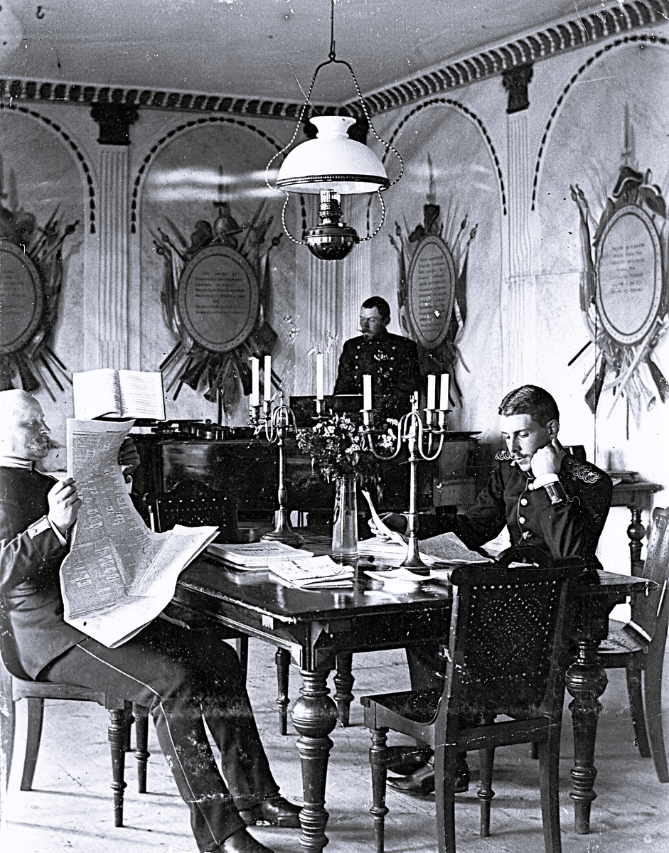 Foto av tre officerare som tar en paus i övningarna vid officersmässen i Mohed. Text i album: "Officersbyggningen, stora salen, 1892, fr v. Stein, Carlén och Sundberg".