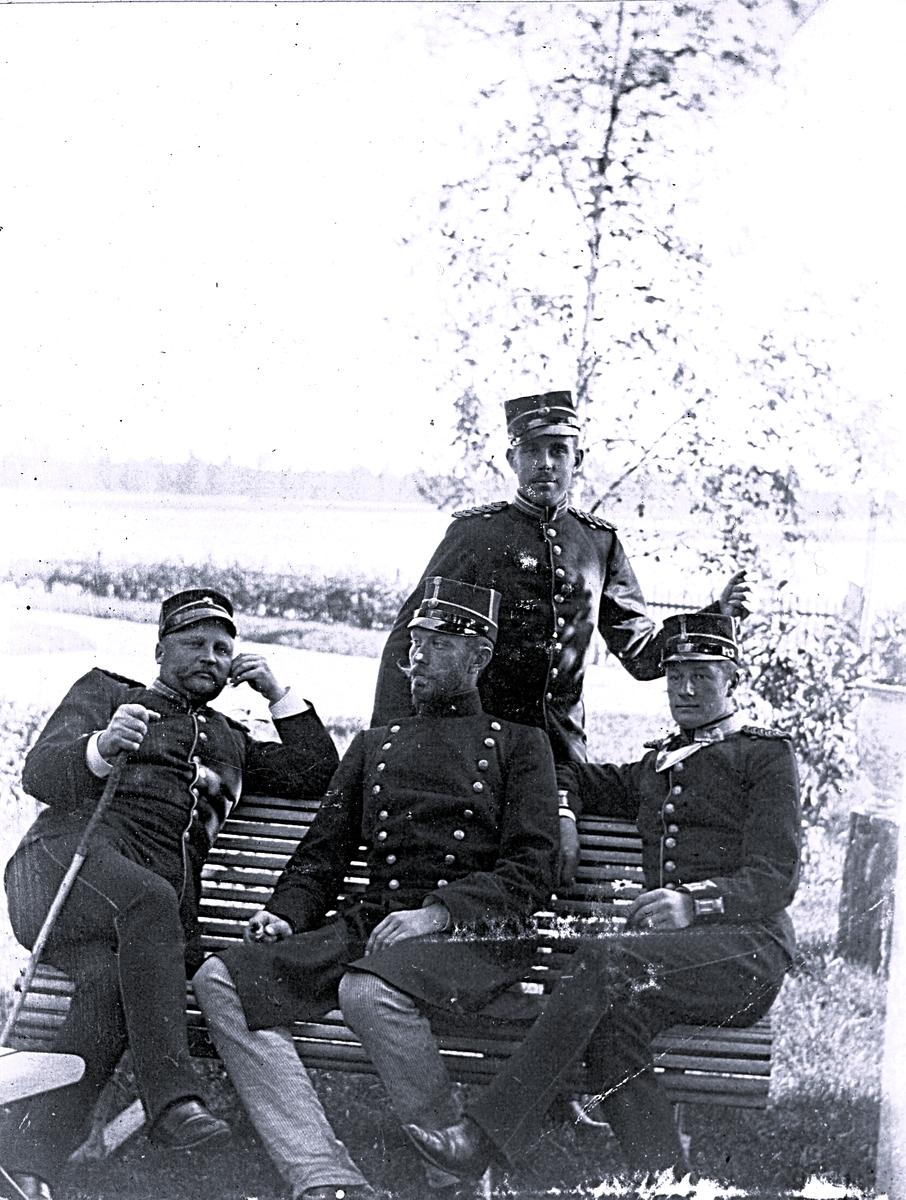 Foto av en grupp officerare som sitter på en bänk och samtalar. Text i album: "Eftermötet 1892. Fr v. Stein, Carlén, Sundberg och Säfvenberg".