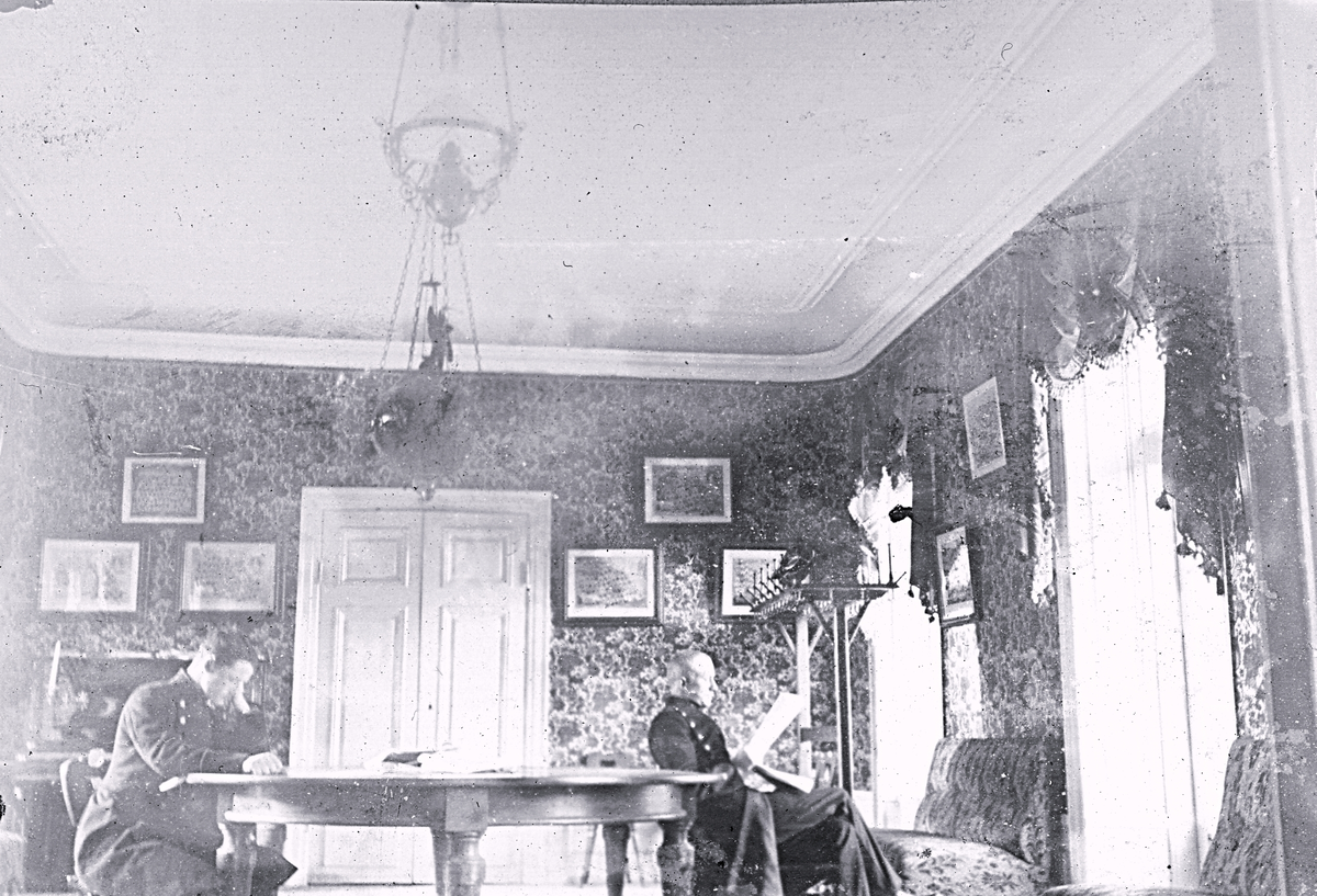 Foto av två uniformerade män som sitter och läser i ett rum vid en officersmäss. Text i album: Fr v. Säfwenberg och Dufwa.