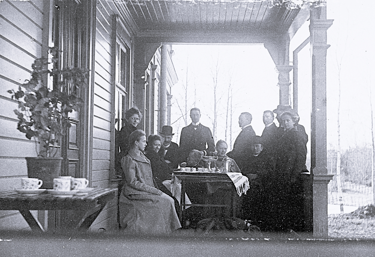 Foto av män och kvinnor som sitter på verandan till Borgsjö prästgård.