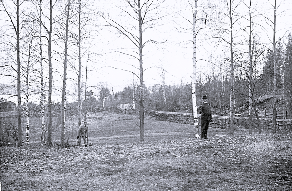Titel: Foto av två män som ser ut att göra någon form av mätning på marken vid Borgsjö. Text i album: "Fr v. Lindencrona och Säfwenberg".