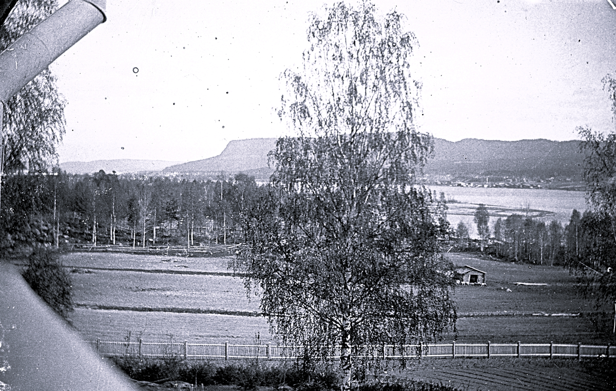Titel: Vy över ett landskap med skog och ängar samt i bakgrunden syns en sjö samt ett berg.