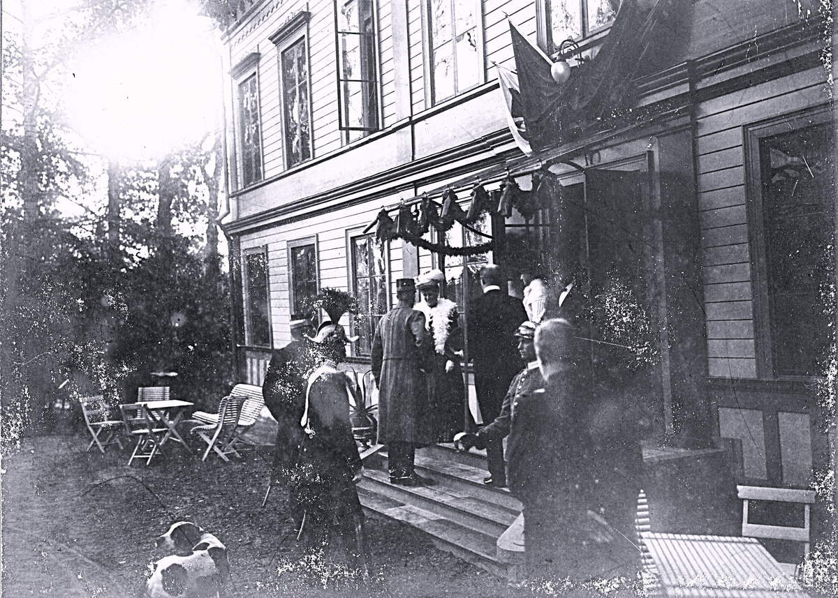 Foto av en grupp människor som står på en trapp framför ett hus, verkar vara en social sammankomst inom det militära.