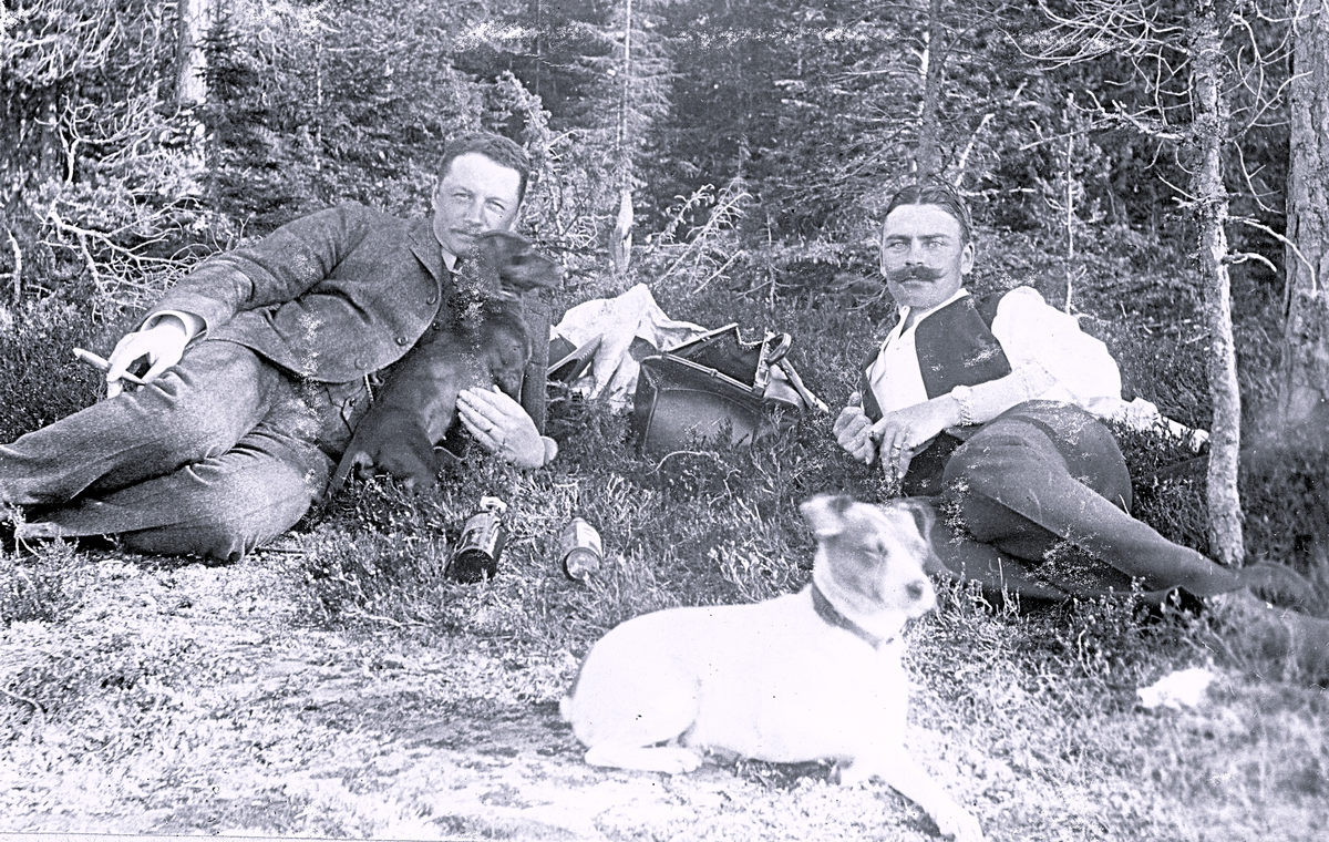 Foto av två män och två hundar som tar en vila i vad som verkar vara ett skogsparti.