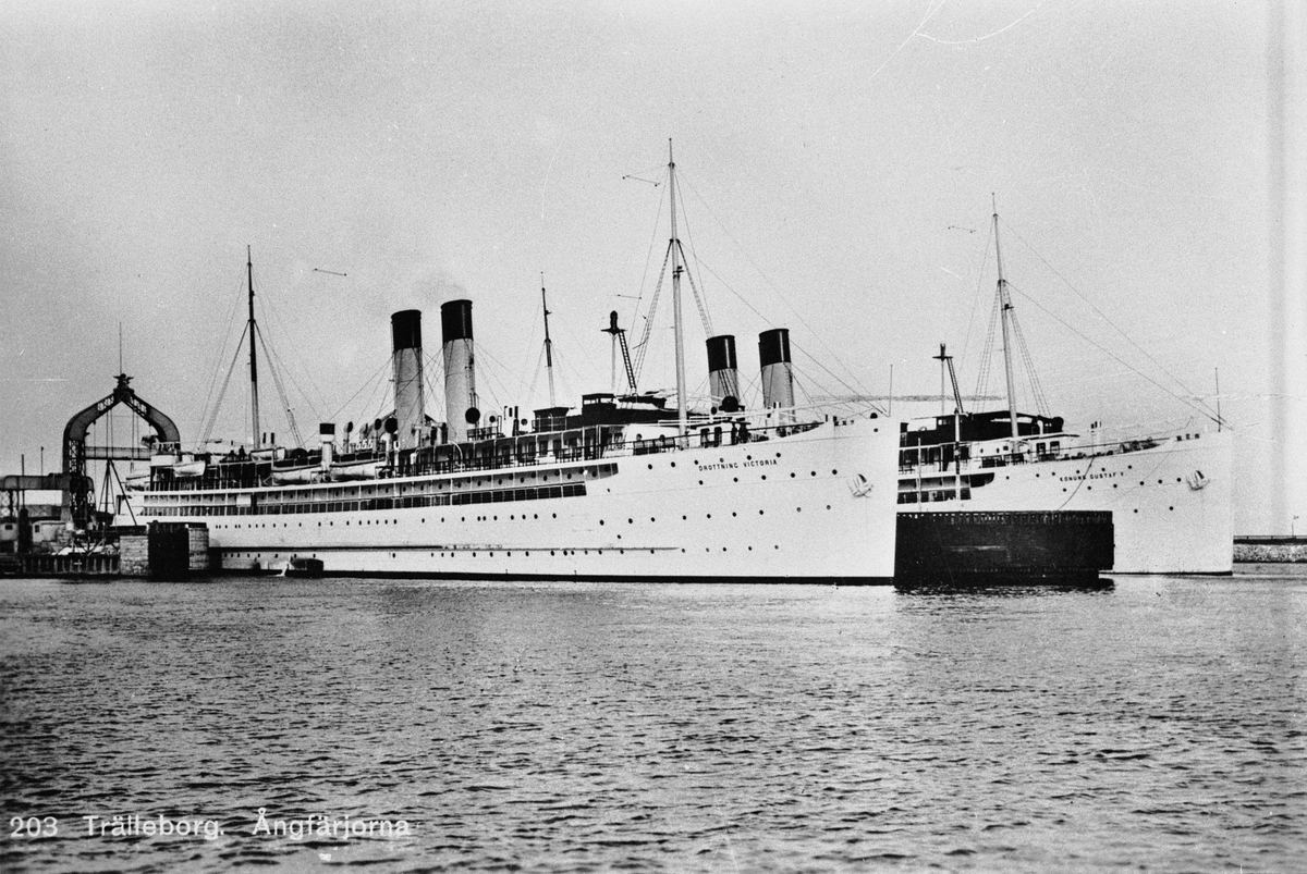 Ångtågfärjorna DROTTNING VICTORIA och KONUNG GUSTAF V i Trelleborgs hamn. Vykort.